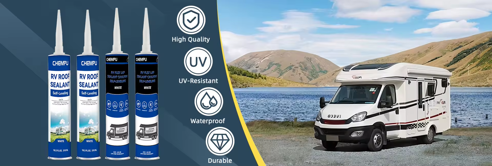 CHEM PU MS-30RV is a high-performance, self-leveling lap sealant designed for long-lasting, flexible waterproofing in demanding mobile and architectural applications. Engineered for ease of use, durability, and environmental safety, it provides a clean, UV-stable, and permanent seal that moves with your structure—whether on the road or on the roof.